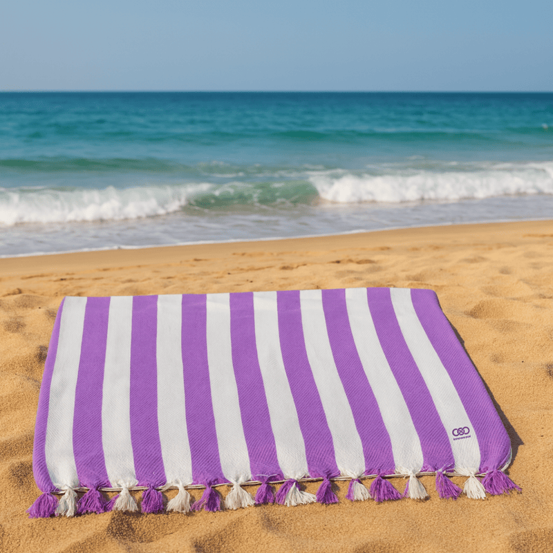Designed for sunny getaways and making a statement, the Wave Lines – XXL Premium Cotton Beach Towel features striking vertical stripe patterns and exceptional softness. The towel showcases evenly spaced white and vibrant coloured stripes in shades such as lavender, mustard yellow, and aqua blue, blending timeless design with the trusted comfort of innoweave. Woven from soft, breathable cotton, each towel offers excellent absorbency and a lightweight feel. With a generous XXL size, it provides full-body coverage after a swim or can be used for lounging in style. The towel is finished with hand-knotted fringes and displays the innoweave logo for a distinctive touch.