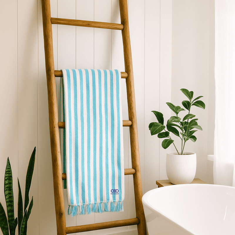 Lightweight cotton towels in elegant herringbone stripes. Soft, quick-drying, and stylish — ideal for daily use and travel.